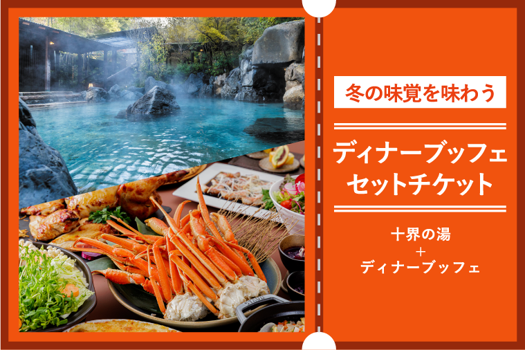 冬の味覚を味わうディナーブッフェセットチケット(十界の湯+ディナーブッフェ)です。冬限定ズワイ蟹など期間限定のメニューが楽しめるディナーブッフェに加え、冬の温泉を楽しめる十界の湯のセットです。 大人(中学生以上)5,400円、小学生3,600円、幼児2,800円